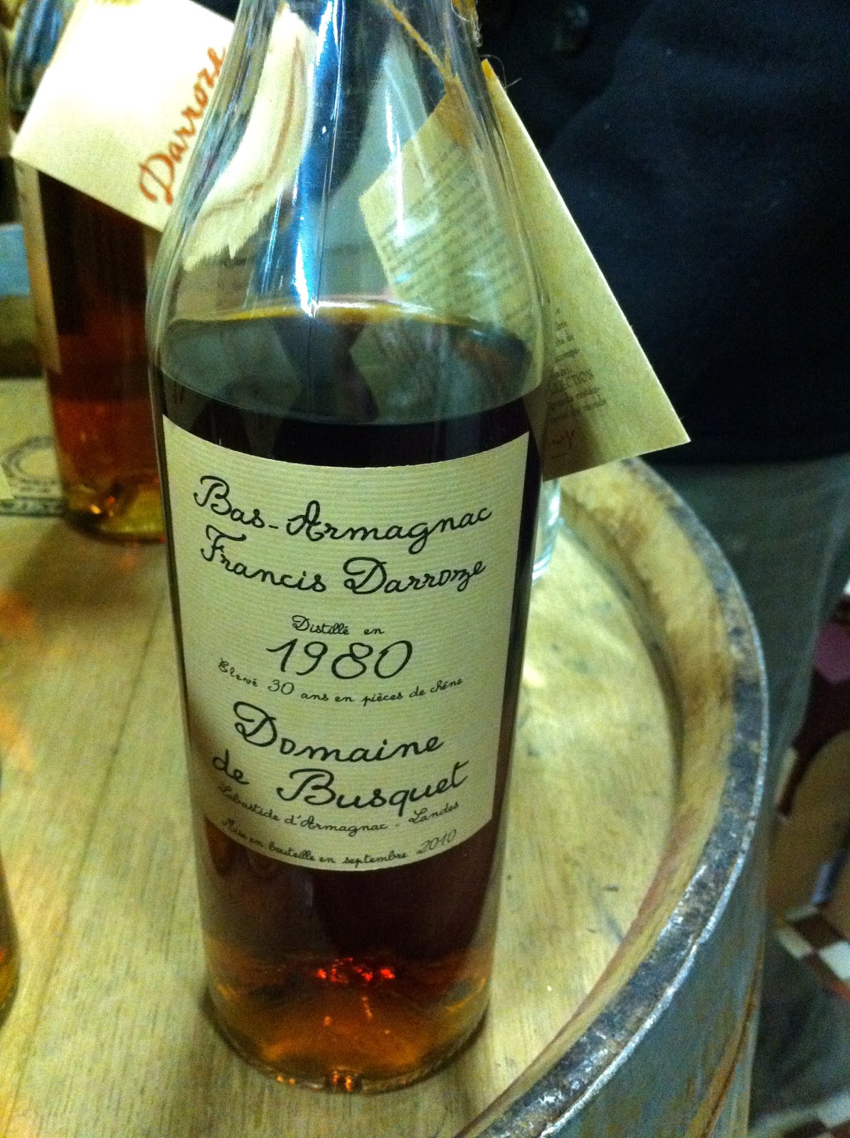 This particular 1980 Darroze Domaine du Busquet (bottled in 2010) was my favorite of the three open that day, but for reasons that were a bit perverse. For instance, it was significantly less conventionally pleasurable than a 1990 Darroze Domaine du Bertruc (bottled in 2010) we tasted, which had a perceptible butterscotch tone beneath the peppery burn. The Domaine du Busquet just seemed more fully-realized, evocative, and coherent in flavor, even if those flavors were all from the seaside-savory spectrum: salt, kelp, iodine, beachwood. It was like the Islay of Armagnac.